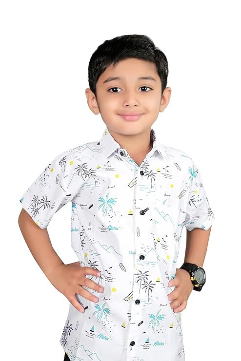 Kid Boy’s Cotton Hawaiian Tropical Printed Shirt with Spread Collar Neck Half Sleeves Button Closure Curved Length | Shirt For Kids Boys | 3652